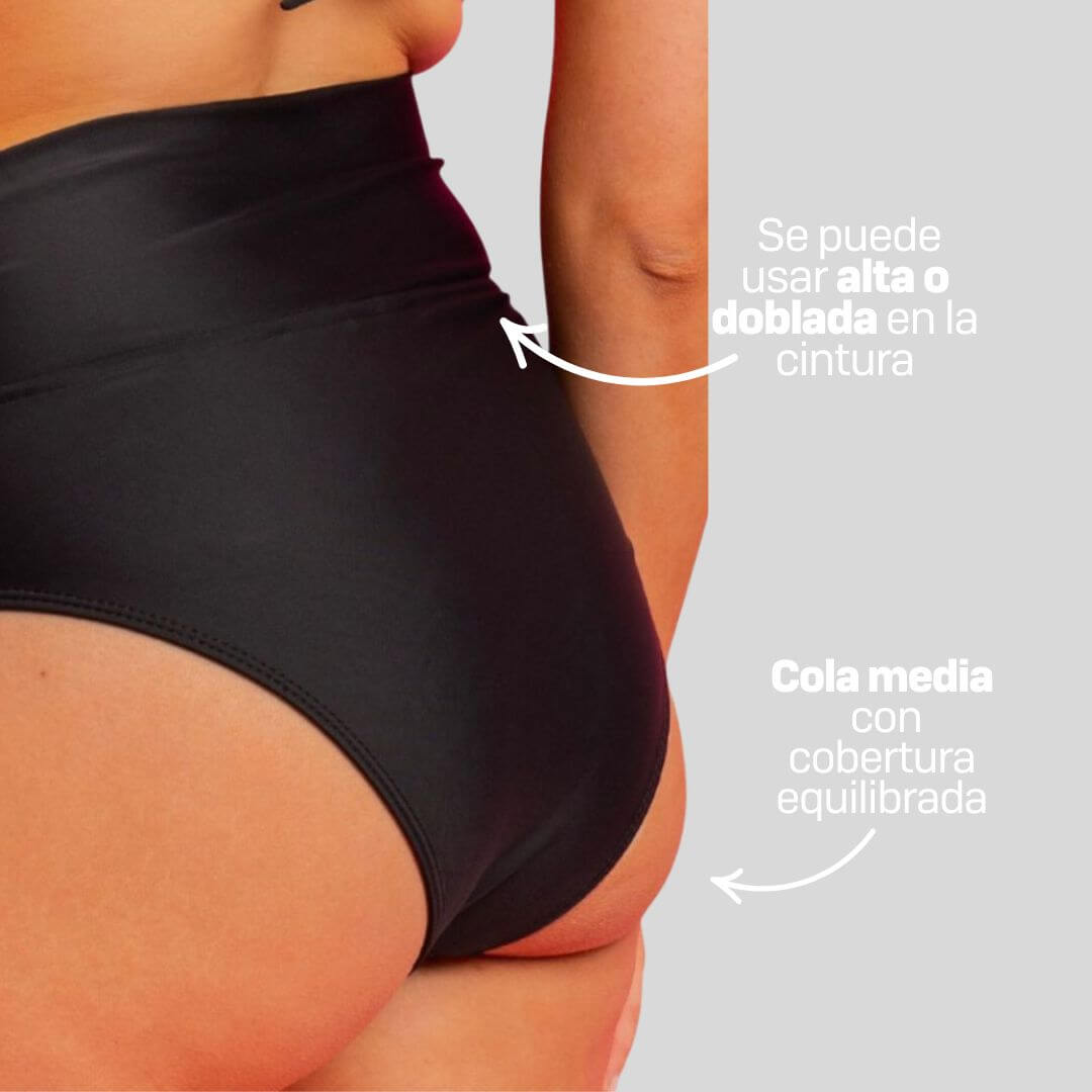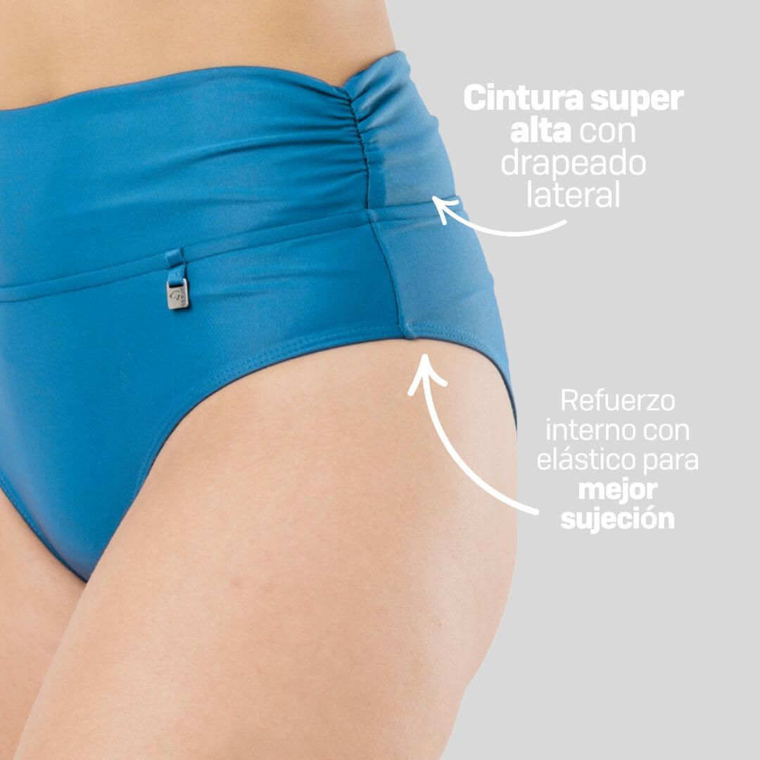 Tiene una cintura super alta, con un detalle drapeado lateral que estiliza la figura sin apretar.