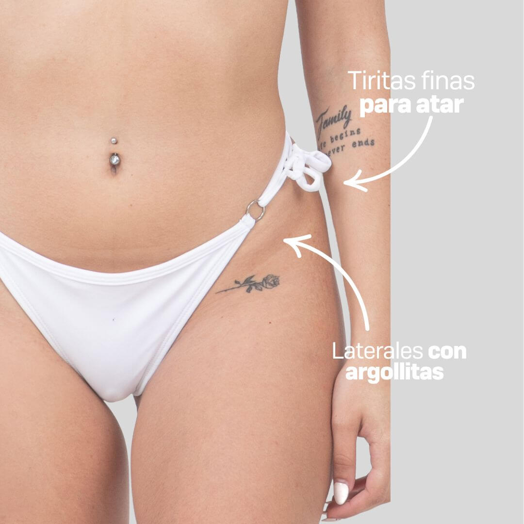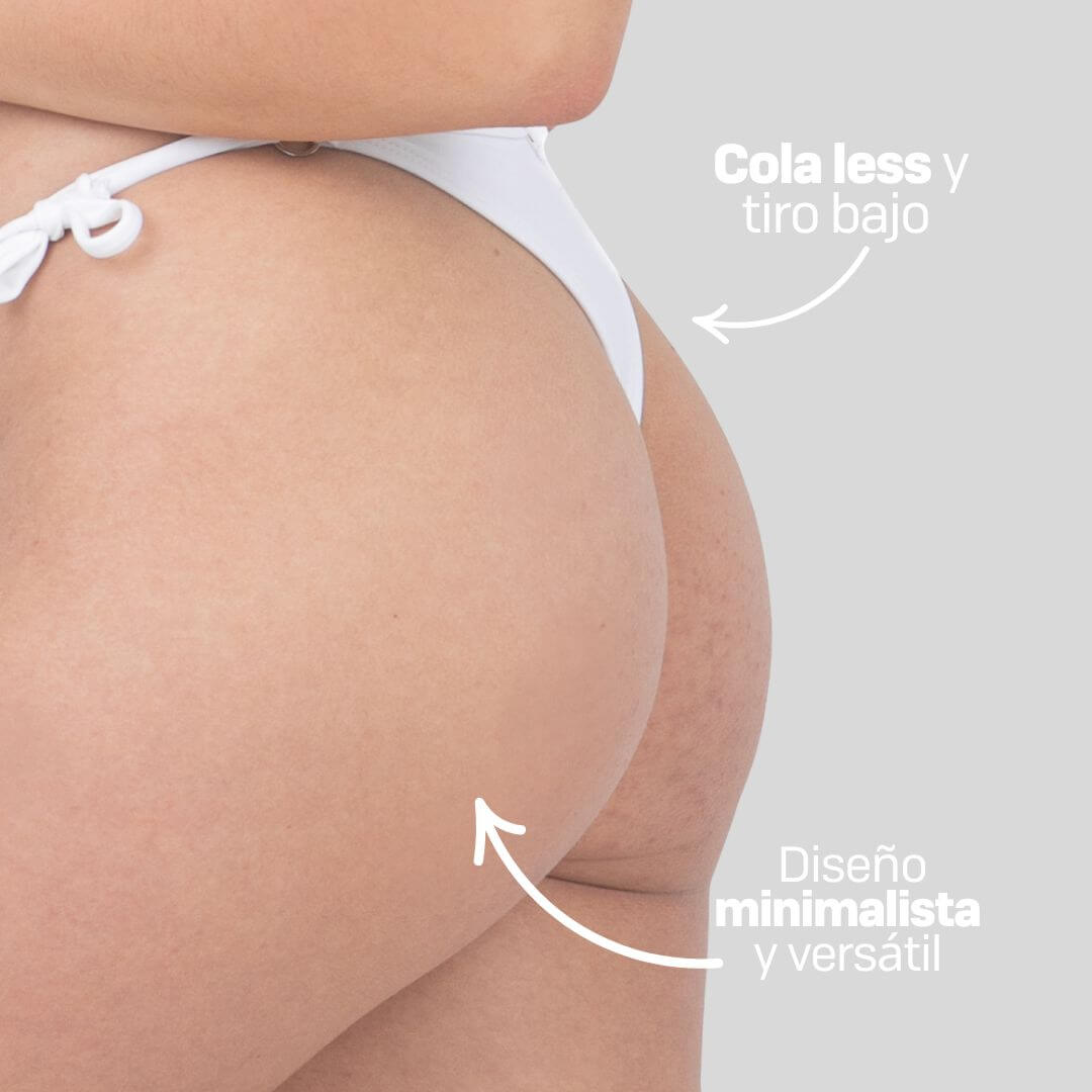 Tiene laterales con argollitas metálicas y tiritas finas que te permiten adaptarla fácilmente a tu contorno de cadera. El tiro es bajo, la cola less y el calce bien elastizado para que se adapte a vos sin marcar.