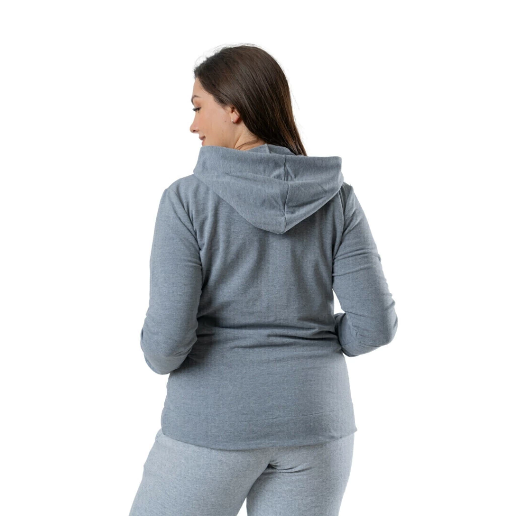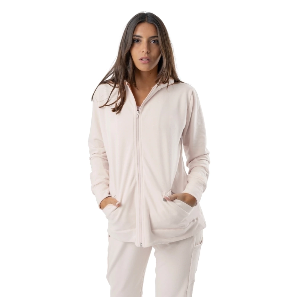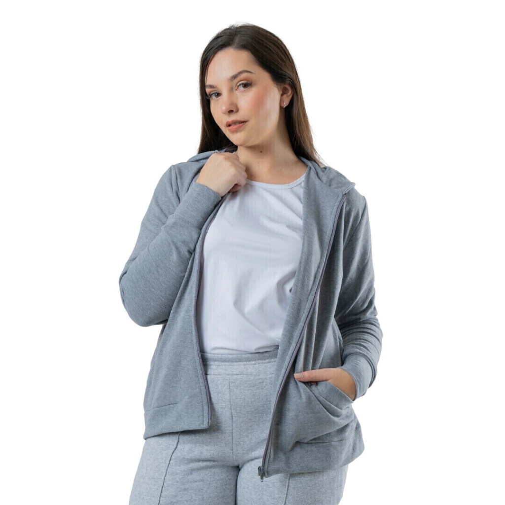 Campera de rústico de algodón elástizado, con capucha y bolsillos frontales. Espalda levemente más larga en la parte inferior