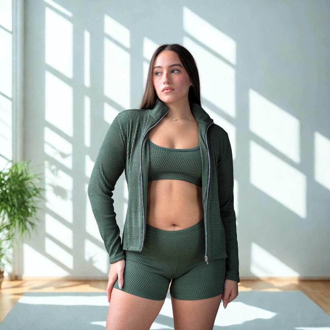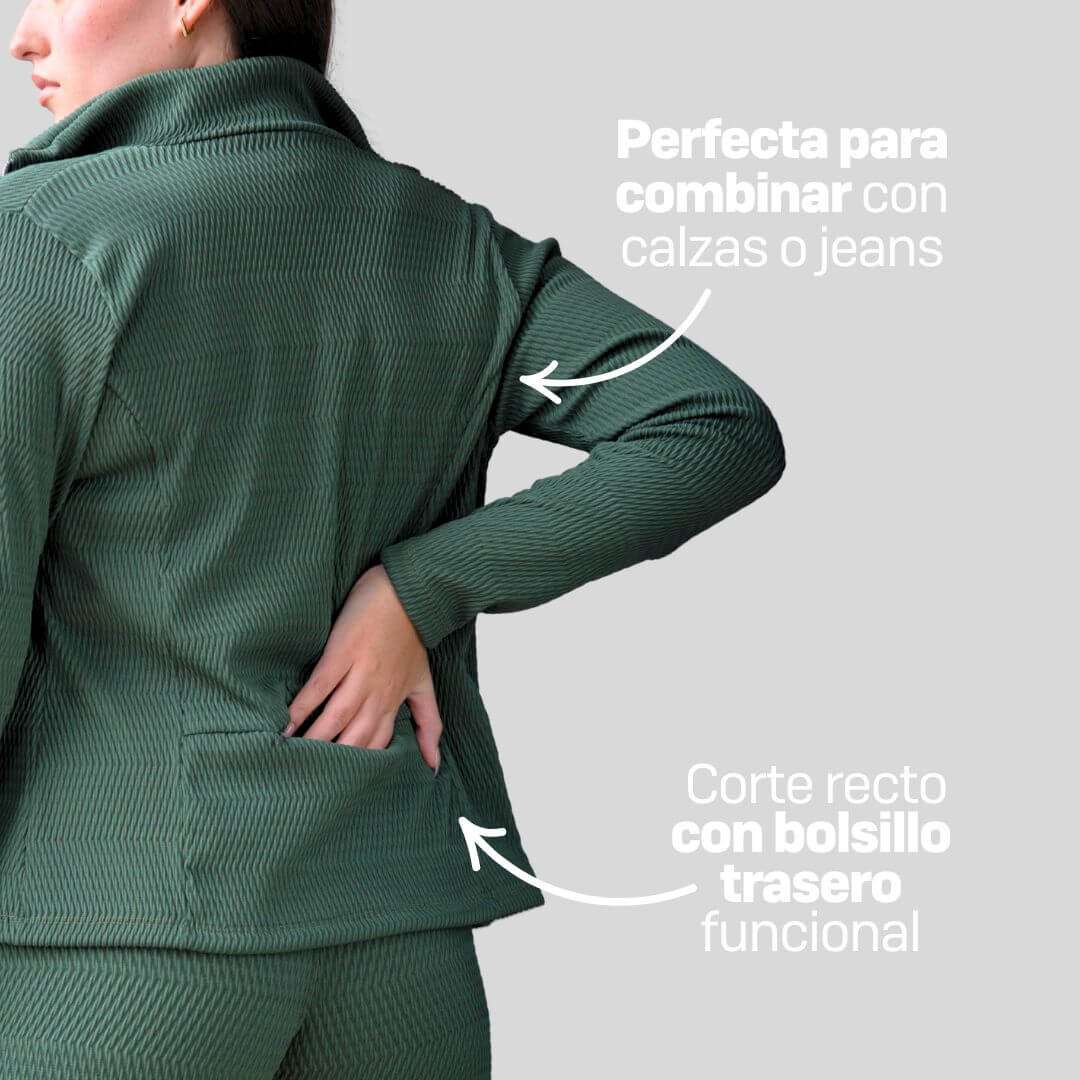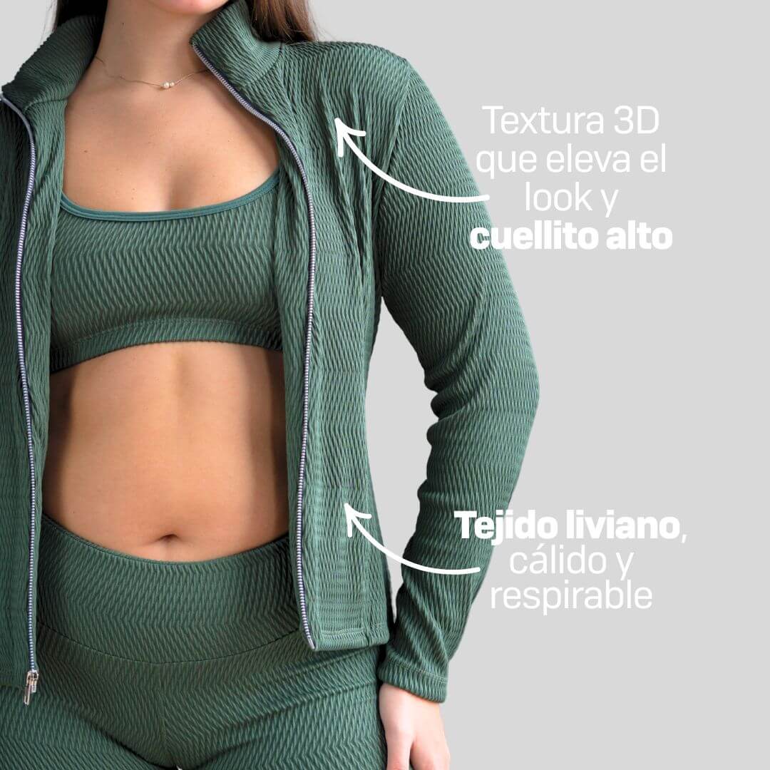 Su tejido liviano y cálido con textura 3D ofrece un equilibrio perfecto entre confort y diseño.