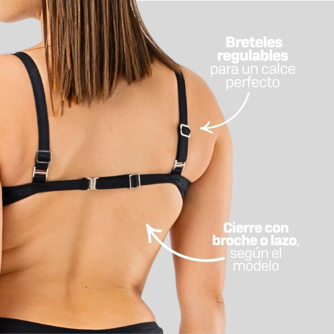 Su diseño se adapta a todo tipo de cuerpos gracias a los breteles regulables y cierre con broche o lazo.