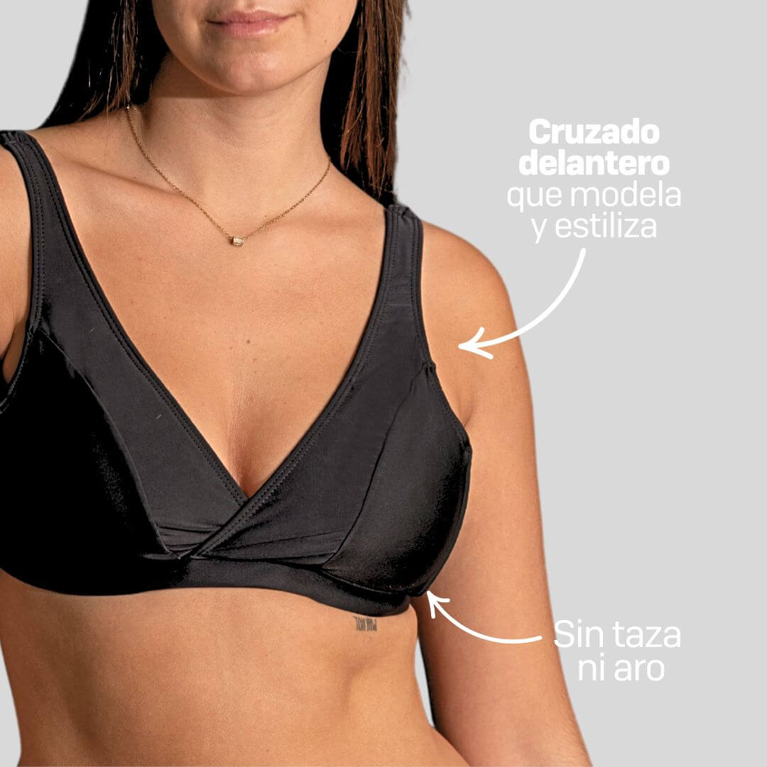 Tiene gran capacidad y está diseñado para sostener sin incomodar. Su base ancha, los laterales altos y el cruce delantero proporcionan sujeción y forma al busto sin sumar volumen.