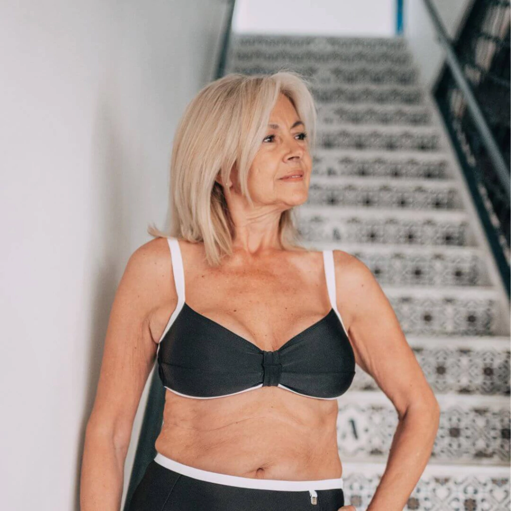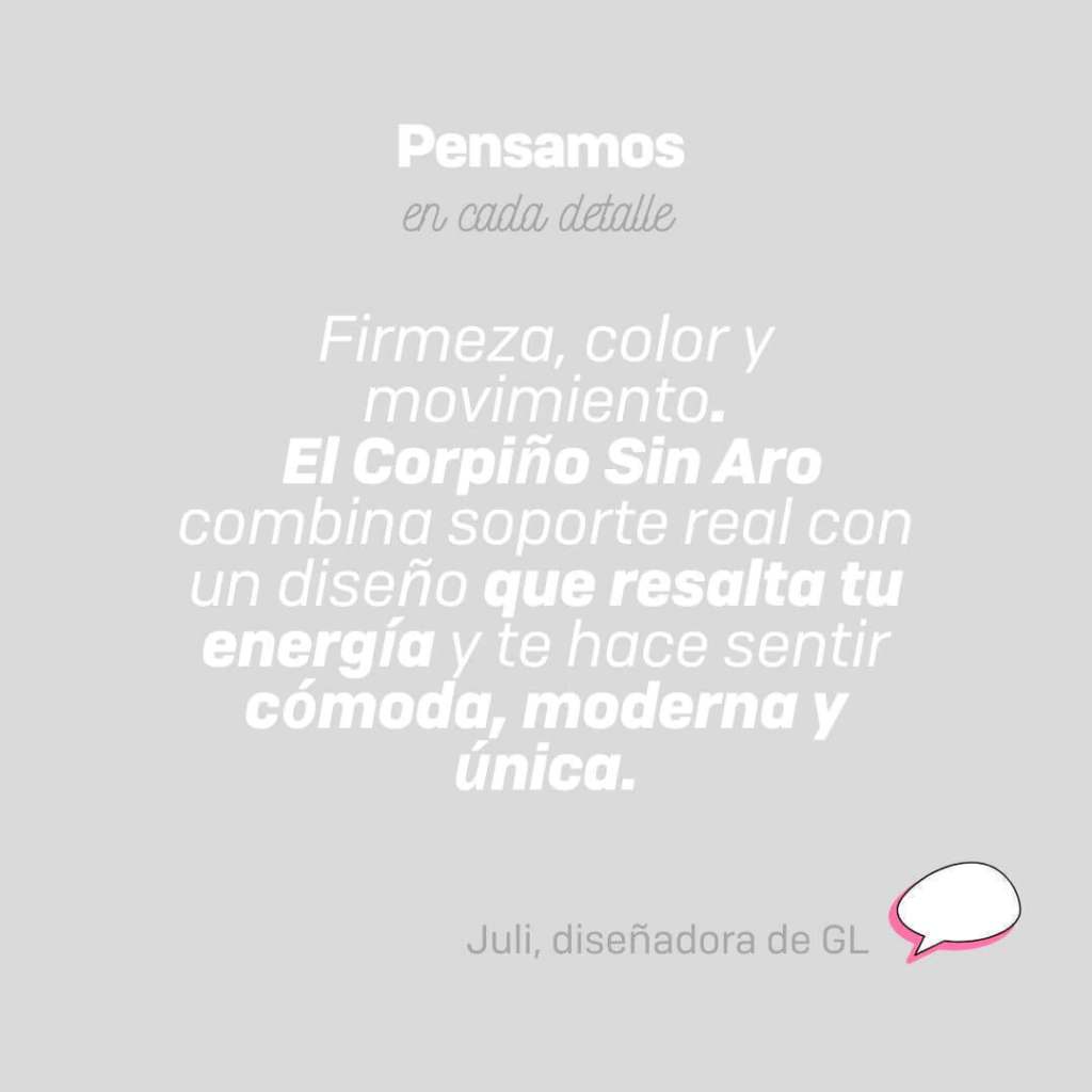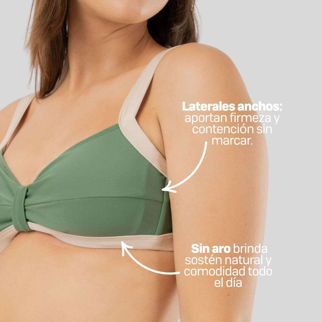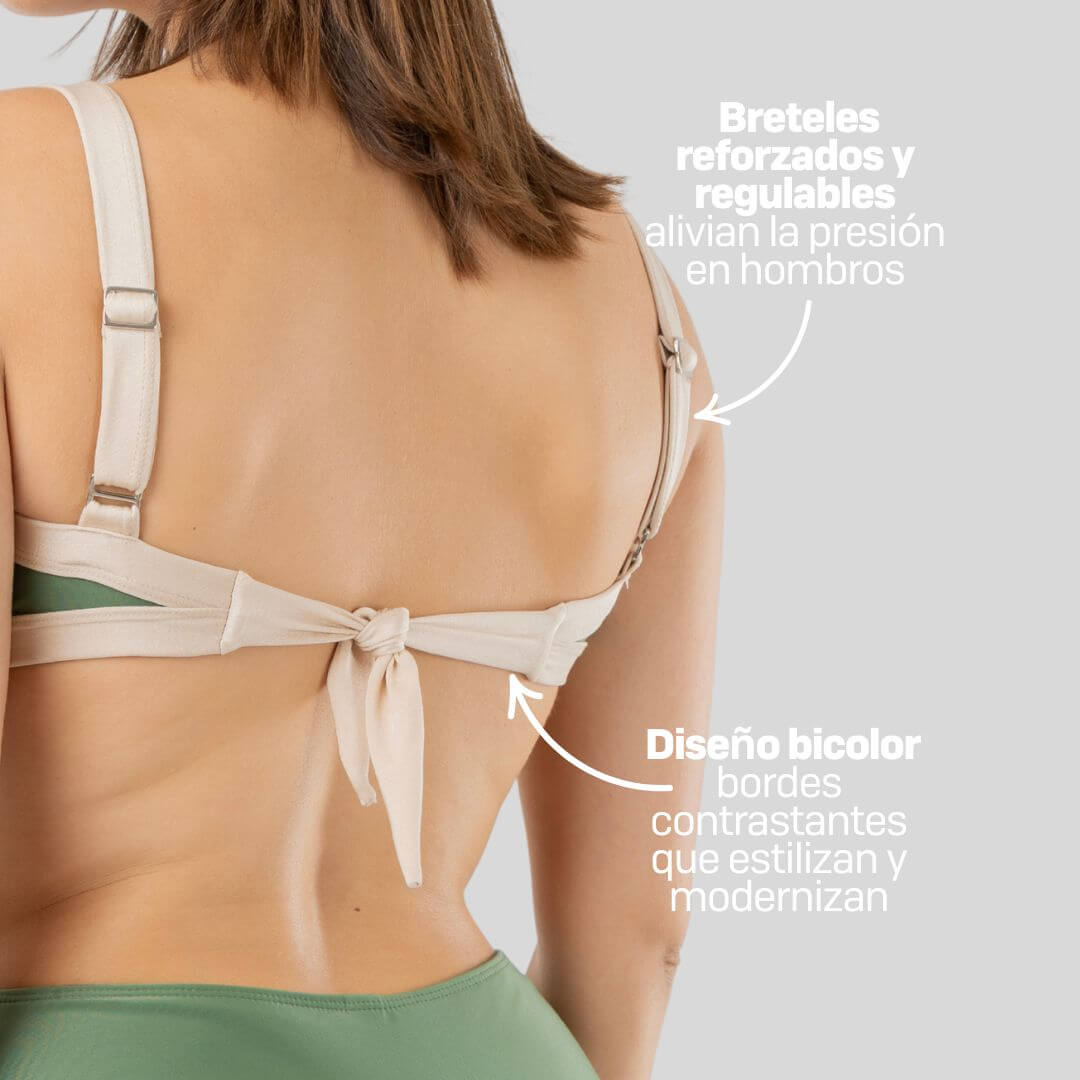 Sigue ofreciendo la misma contención superior, gracias a sus laterales anchos, breteles ajustables y ajuste central removible, pero con un acabado visual moderno y lleno de personalidad.