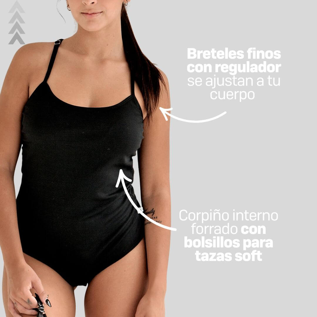 Con breteles finos regulables, bolsillos para taza soft y cola semicavada, esta malla tiene un diseño juvenil y canchero, ideal para busto pequeño o medio que necesita contención sin marcar.