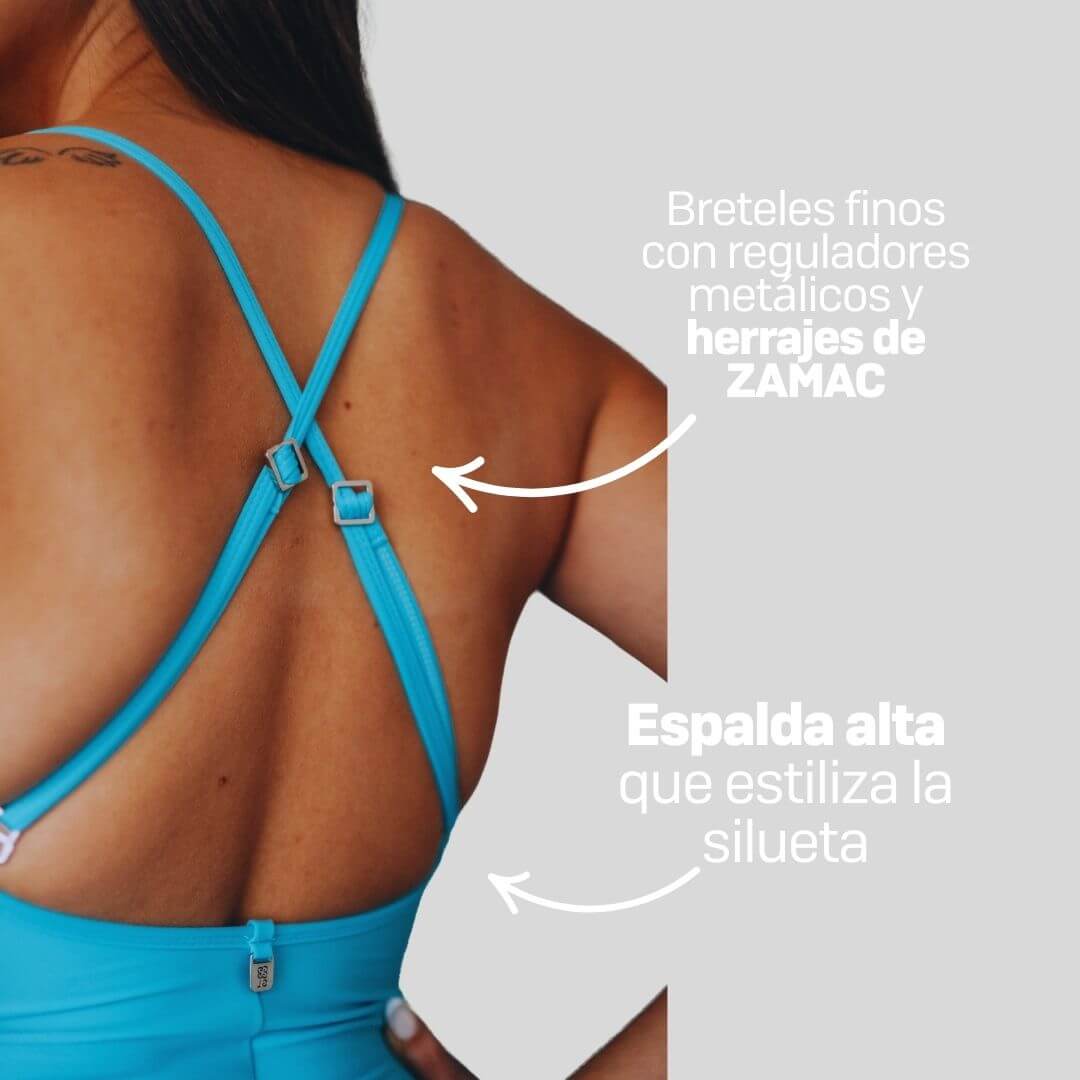 Pensada para destacar con seguridad, tiene un escote profundo, espalda cruzada, cola semiless y ahora suma un toque especial: herrajes metálicos de ZAMAC en los breteles, que no se oxidan ni se calientan al sol.