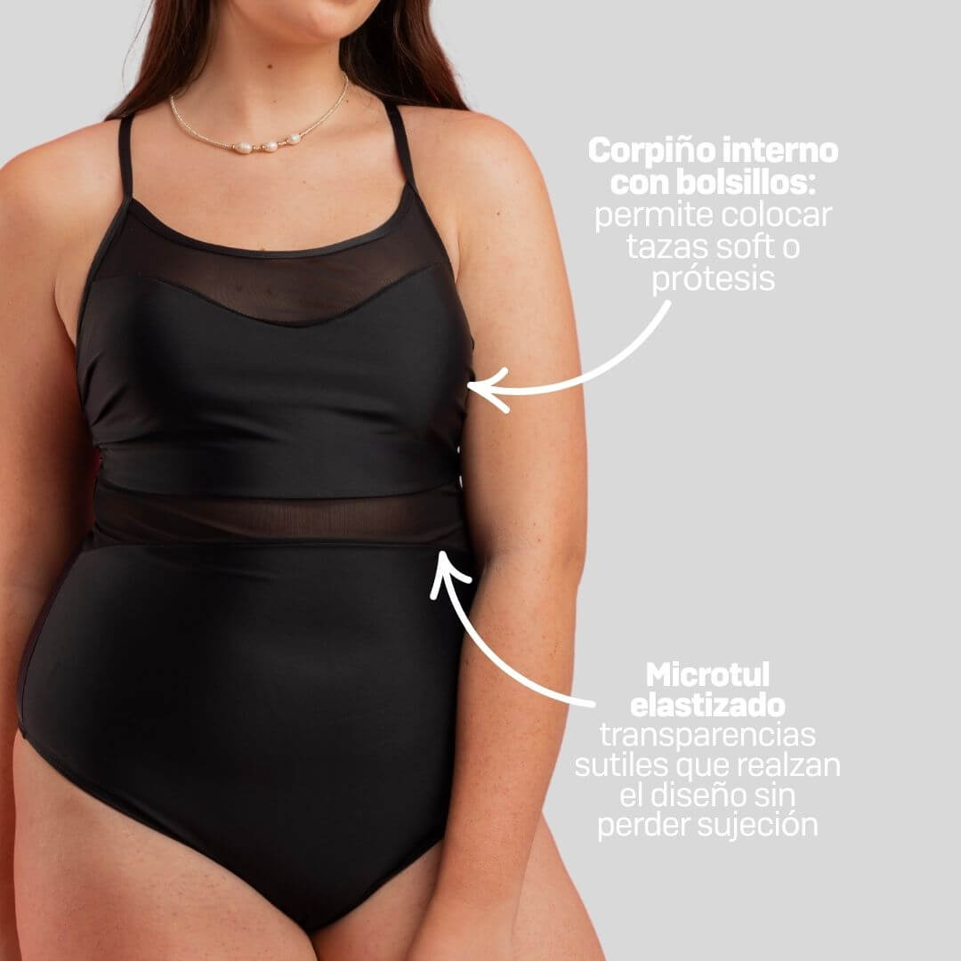 Con detalles de microtul elastizado en puntos estratégicos, ofrece un efecto visual que estiliza y resalta la figura sin perder firmeza ni soporte.