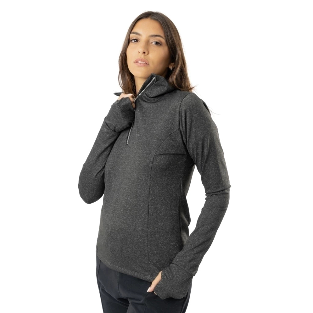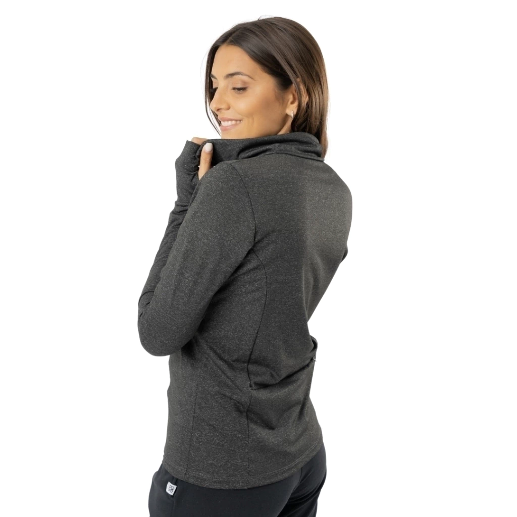 Buzo entallado, elastizado, con cuello alto, amplio bolsillo trasero con cierre y puño largo con pasadedo.