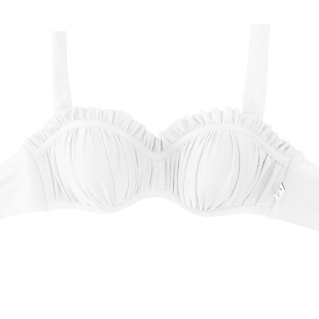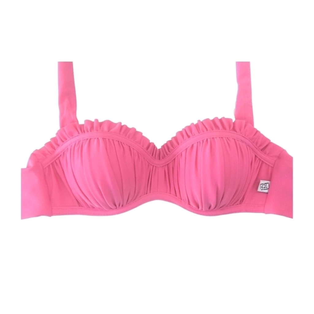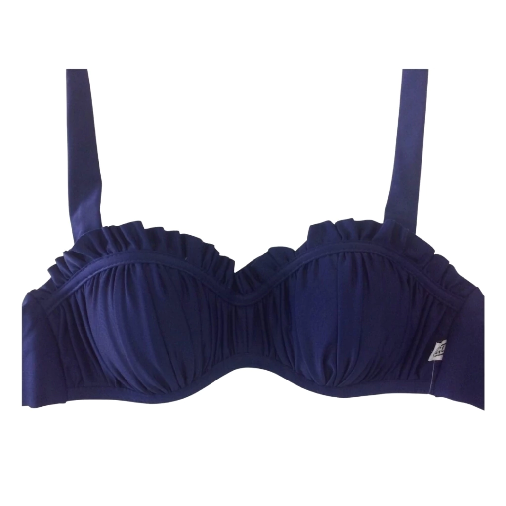 Top con drapeado vertical, escote corazón, borde superior con voladitos. Toda la delantera es "armada"con tazas soft fijas. Tiene breteles opcionales, y ajuste con nudo en espalda
