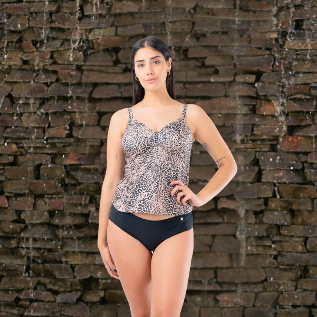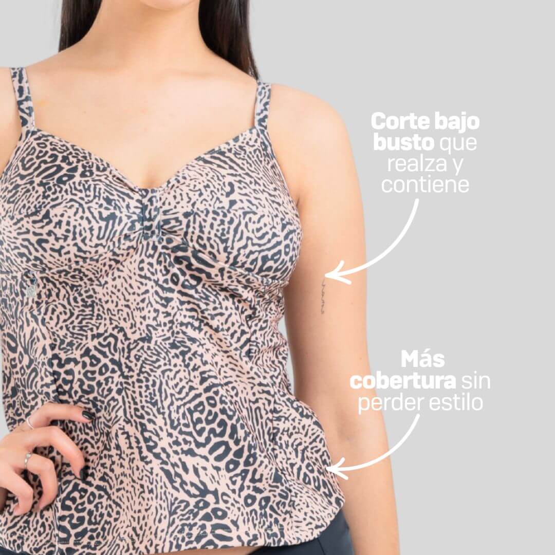 Este tankini tiene corte bajo busto que estiliza la silueta y ofrece un excelente sostén, incluso para bustos generosos.