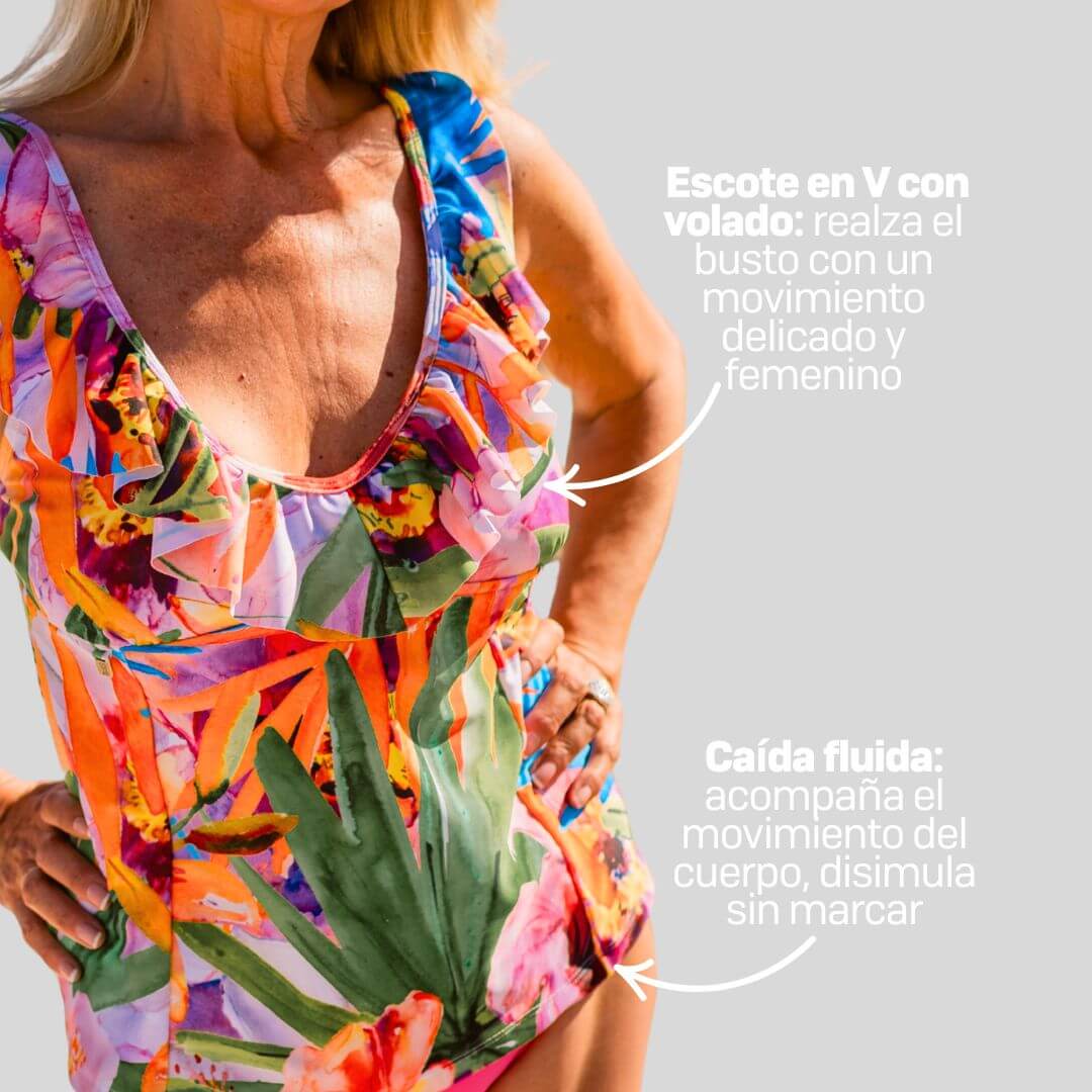 El corte bajo busto brinda soporte sin ajustar de más, logrando una prenda fresca, femenina y práctica, ideal para quienes buscan una malla con más cobertura sin resignar estilo.