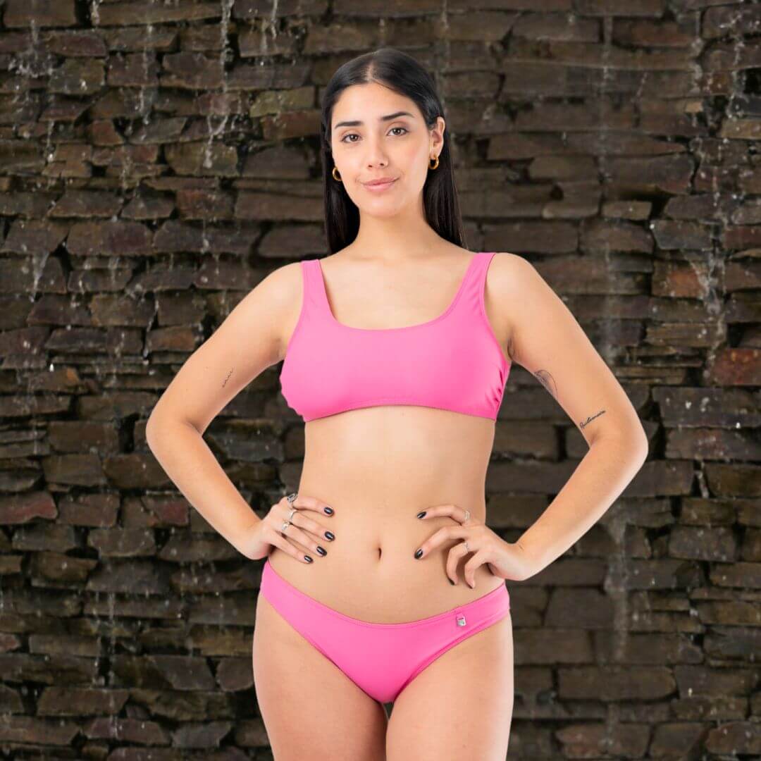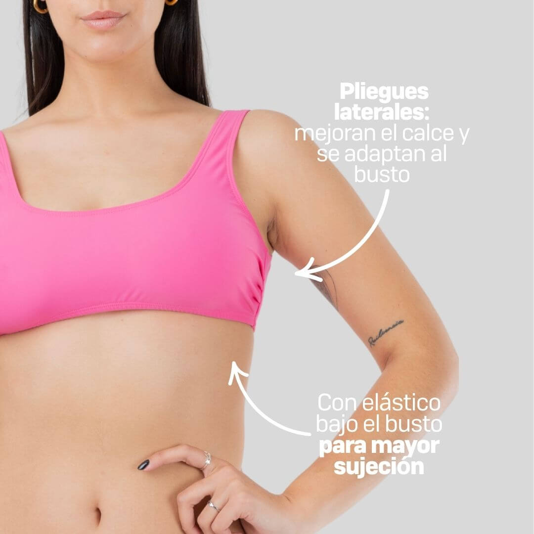 Diseñado con pliegues laterales que se adaptan al busto y breteles anchos que distribuyen el peso sin marcar, ofrece un calce seguro y favorecedor.