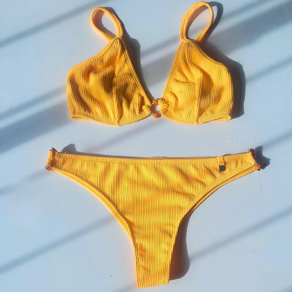 El detalle de cuentas en el centro del busto aporta un toque de brillo y color que realza los tonos de la prenda y el bronceado.