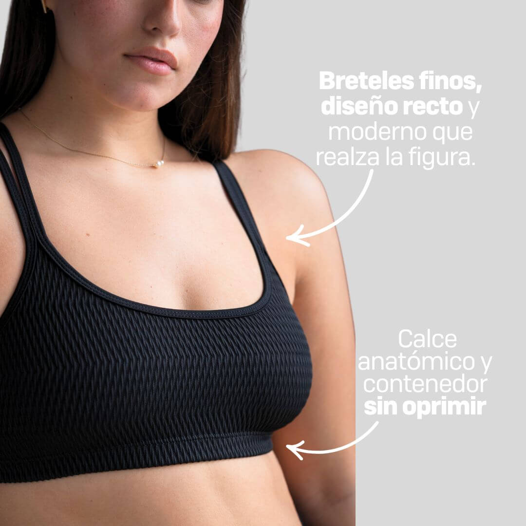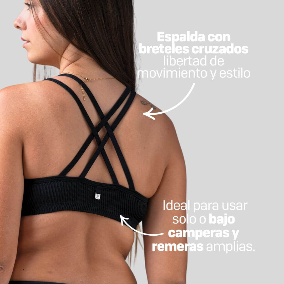 La espalda con breteles cruzados le da un toque urbano y femenino, brindando sujeción sin rigidez.