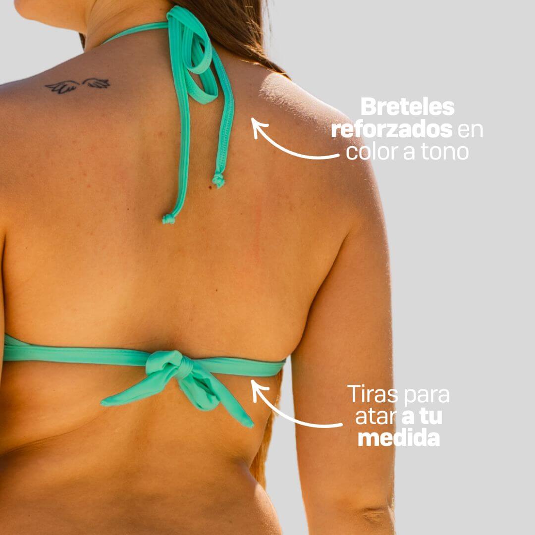 Con copas triangulares, taza soft incluida y tiras finas para atar en cuello y espalda, se adapta a tu cuerpo como vos lo necesites.
