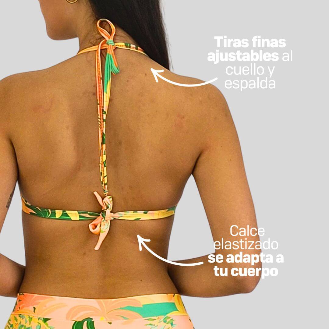 Con copas triangulares, taza soft incluida y tiras finas para atar en cuello y espalda, se adapta a tu cuerpo como vos lo necesites.